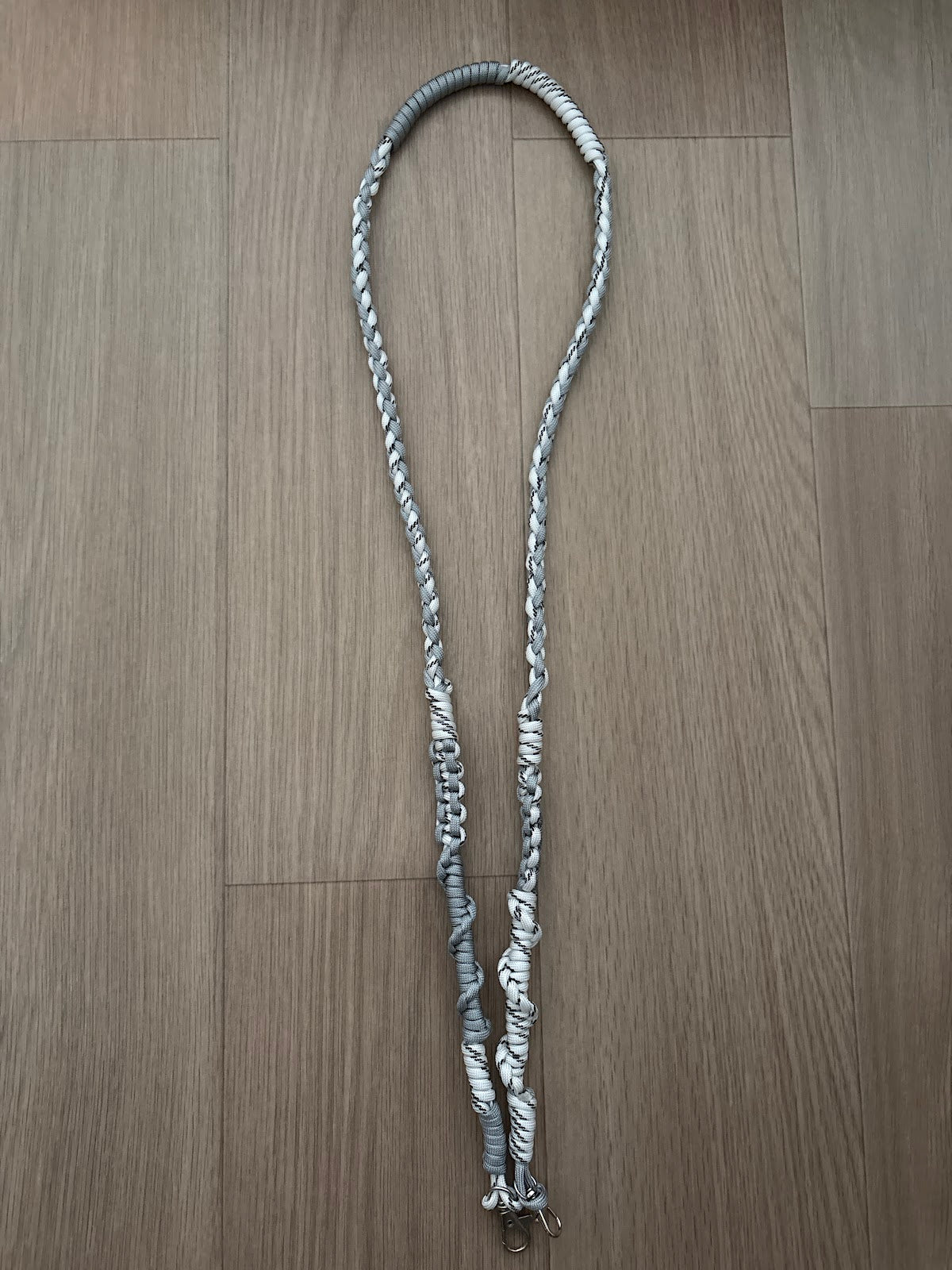 パラコードでつくったスマホショルダーです。スマホを肩や首から下げたり、バッグにつければ持ち手やショルダーにも使えます。焼き止め加工をしておりますが、あまりに強く引っ張ると解ける可能性がありますので、お気をつけください。ストラップの全長は編み部分が121センチ。ナスカンなのでさまざまなものに装着できます。